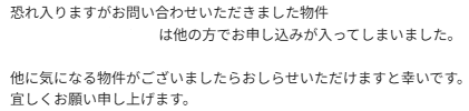気になる物件を問い合わせてみた結果、1日で埋まってました。あとは「掲載している部屋は商談中だけど他の階なら空室あります」という返信もありました。